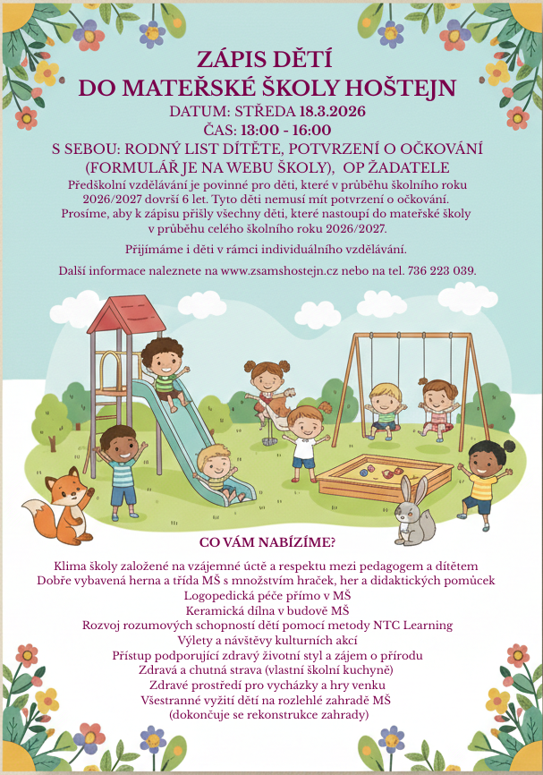 Pro školní rok 2026/2027 se zápis do mateřské školy uskuteční ve středu 18. března 2026.
